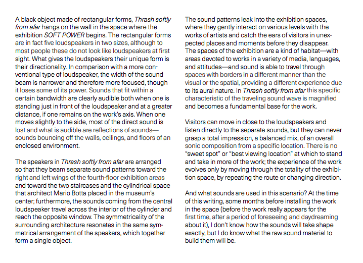 Text from Catalogue Soft Power Published 09/12/2019 at 718 × 521 in Thrash softly from afar – SFMOMA ← Previous Next → Share this:Share Share on Facebook (Opens in new window) Facebook Share on X (Opens in new window) X Like Loading...